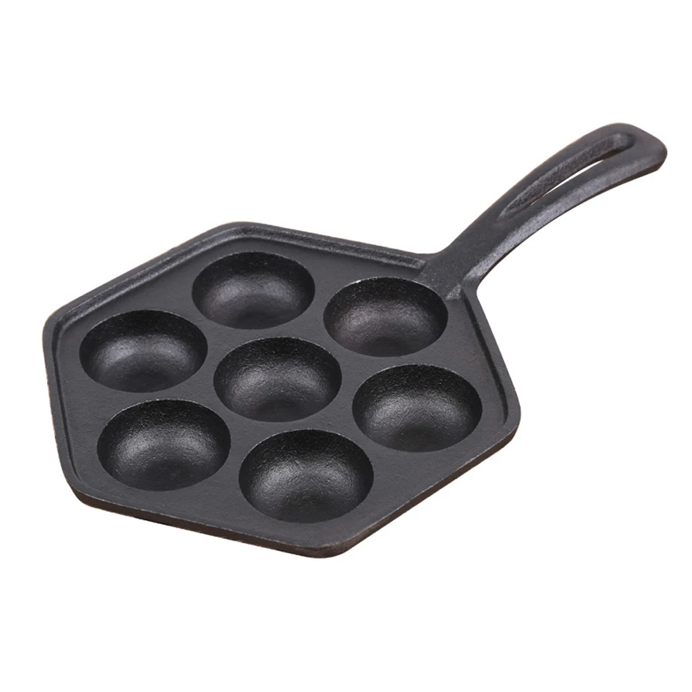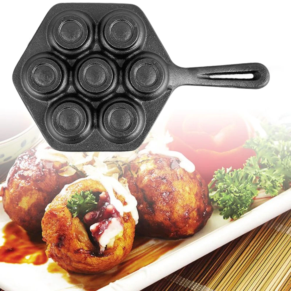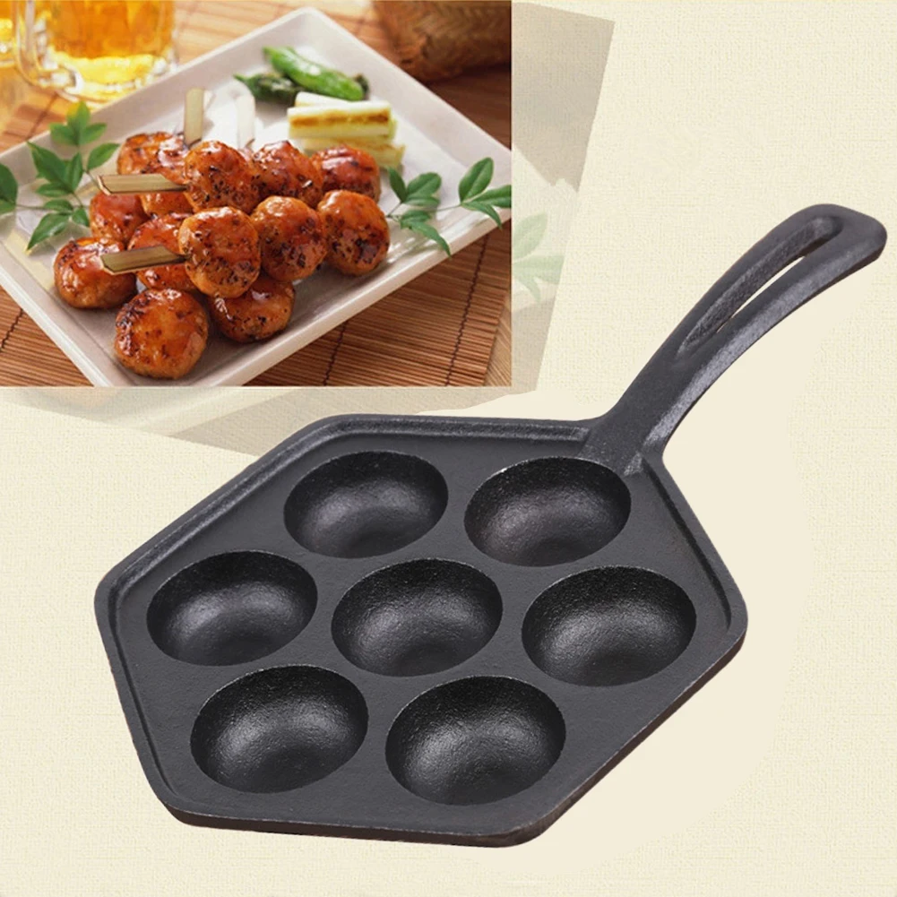 HOT Sale With Handle Cast Iron Takoyaki Mold 7 Holes Portable Griddle Meatball Kitchen Hexagon Hanging Non S